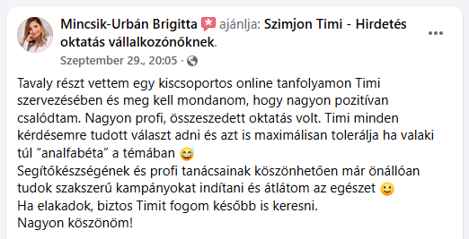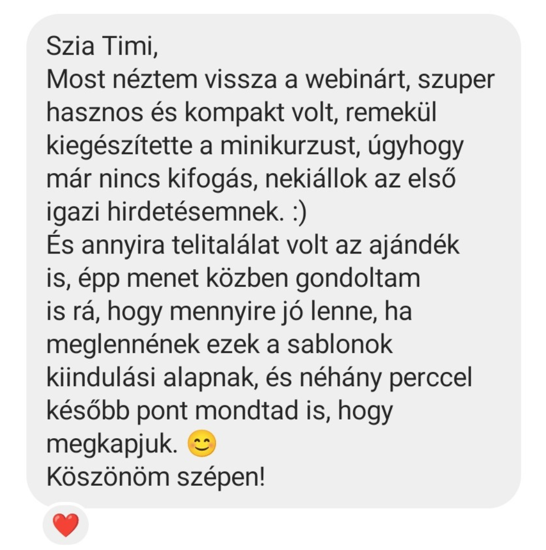 A kampányom kellős közepén azonnali profi segítséget kaptam Timitől a hirdetéseim beállításánál. Köszönöm, hálás vagyok érte! Mindenkinek ajánlom, ha elakadásai vannak a hirdetéssel kapcsolatban. ☺️